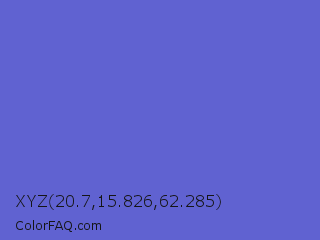 XYZ 20.7,15.826,62.285 Color is a normal blue color and the nearest color is Slate Blue #6a5acd. Hex code #6062d1 and RGB value is rgb(96,98,209). In RGB color space, this color is composed of 38% red, 38% green, 82% blue, In CMYK color space, this color is composed of 54% cyan, 53% magenta, 0% yellow , 18% black , In HSL color space, this color has a hue angle of 239° , 55% saturation and 60% lightness.
