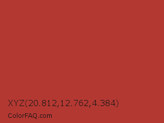 XYZ 20.812,12.762,4.384 Color is a normal red color and the nearest color is Well Read #b43332. Hex code #b43832 and RGB value is rgb(180,56,50). In RGB color space, this color is composed of 71% red, 22% green, 20% blue, In CMYK color space, this color is composed of 0% cyan, 69% magenta, 72% yellow , 29% black , In HSL color space, this color has a hue angle of 3° , 57% saturation and 45% lightness.