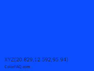 XYZ 20.829,12.592,95.94 Color is a normal blue color and the nearest color is Blue RYB #0247fe. Hex code #0a4dff and RGB value is rgb(10,77,255). In RGB color space, this color is composed of 4% red, 30% green, 100% blue, In CMYK color space, this color is composed of 96% cyan, 70% magenta, 0% yellow , 0% black , In HSL color space, this color has a hue angle of 224° , 100% saturation and 52% lightness.