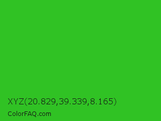 XYZ 20.829,39.339,8.165 Color is a normal green color and the nearest color is Lime Green #32cd32. Hex code #30c224 and RGB value is rgb(48,194,36). In RGB color space, this color is composed of 19% red, 76% green, 14% blue, In CMYK color space, this color is composed of 75% cyan, 0% magenta, 81% yellow , 24% black , In HSL color space, this color has a hue angle of 115° , 69% saturation and 45% lightness.