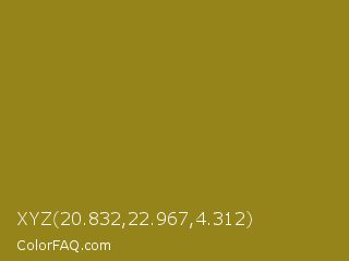 XYZ 20.832,22.967,4.312 Color is a normal yellow color and the nearest color is Hacienda #98811b. Hex code #95841a and RGB value is rgb(149,132,26). In RGB color space, this color is composed of 58% red, 52% green, 10% blue, In CMYK color space, this color is composed of 0% cyan, 11% magenta, 83% yellow , 42% black , In HSL color space, this color has a hue angle of 52° , 70% saturation and 34% lightness.