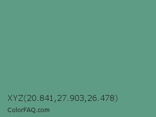 XYZ 20.841,27.903,26.478 Color is a normal green color and the nearest color is Patina #639a8f. Hex code #5f9c85 and RGB value is rgb(95,156,133). In RGB color space, this color is composed of 37% red, 61% green, 52% blue, In CMYK color space, this color is composed of 39% cyan, 0% magenta, 15% yellow , 39% black , In HSL color space, this color has a hue angle of 157° , 24% saturation and 49% lightness.