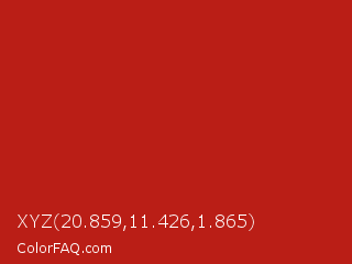 XYZ 20.859,11.426,1.865 Color is a normal red color and the nearest color is Carnelian #b31b1b. Hex code #ba1e16 and RGB value is rgb(186,30,22). In RGB color space, this color is composed of 73% red, 12% green, 9% blue, In CMYK color space, this color is composed of 0% cyan, 84% magenta, 88% yellow , 27% black , In HSL color space, this color has a hue angle of 3° , 79% saturation and 41% lightness.