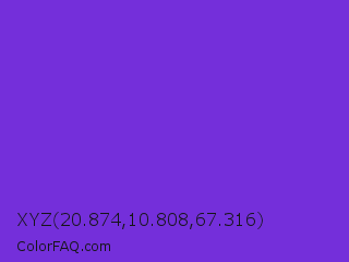 XYZ 20.874,10.808,67.316 Color is a normal violet color and the nearest color is Blue Violet #8a2be2. Hex code #742fda and RGB value is rgb(116,47,218). In RGB color space, this color is composed of 45% red, 18% green, 85% blue, In CMYK color space, this color is composed of 47% cyan, 78% magenta, 0% yellow , 15% black , In HSL color space, this color has a hue angle of 264° , 70% saturation and 52% lightness.