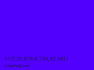 XYZ 20.879,8.734,92.681 Color is a normal indigo color and the nearest color is Electric Ultramarine #3f00ff. Hex code #5000fc and RGB value is rgb(80,0,252). In RGB color space, this color is composed of 31% red, 0% green, 99% blue, In CMYK color space, this color is composed of 68% cyan, 100% magenta, 0% yellow , 1% black , In HSL color space, this color has a hue angle of 259° , 100% saturation and 49% lightness.