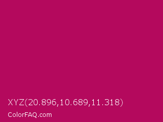 XYZ 20.896,10.689,11.318 Color is a normal rose color and the nearest color is Lipstick #ab0563. Hex code #b4095d and RGB value is rgb(180,9,93). In RGB color space, this color is composed of 71% red, 4% green, 36% blue, In CMYK color space, this color is composed of 0% cyan, 95% magenta, 48% yellow , 29% black , In HSL color space, this color has a hue angle of 331° , 90% saturation and 37% lightness.