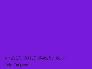 XYZ 20.901,9.846,67.817 Color is a normal violet color and the nearest color is Blue Violet #8a2be2. Hex code #781adb and RGB value is rgb(120,26,219). In RGB color space, this color is composed of 47% red, 10% green, 86% blue, In CMYK color space, this color is composed of 45% cyan, 88% magenta, 0% yellow , 14% black , In HSL color space, this color has a hue angle of 269° , 79% saturation and 48% lightness.
