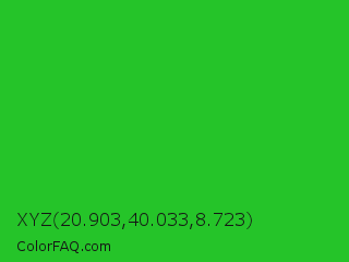 XYZ 20.903,40.033,8.723 Color is a normal green color and the nearest color is Lime Green #32cd32. Hex code #25c429 and RGB value is rgb(37,196,41). In RGB color space, this color is composed of 15% red, 77% green, 16% blue, In CMYK color space, this color is composed of 81% cyan, 0% magenta, 79% yellow , 23% black , In HSL color space, this color has a hue angle of 122° , 68% saturation and 46% lightness.