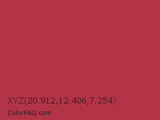 XYZ 20.912,12.406,7.254 Color is a normal red color and the nearest color is Amaranth Purple #ab274f. Hex code #b33347 and RGB value is rgb(179,51,71). In RGB color space, this color is composed of 70% red, 20% green, 28% blue, In CMYK color space, this color is composed of 0% cyan, 72% magenta, 60% yellow , 30% black , In HSL color space, this color has a hue angle of 351° , 56% saturation and 45% lightness.