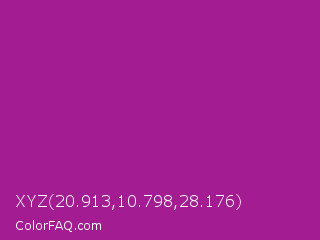 XYZ 20.913,10.798,28.176 Color is a normal magenta color and the nearest color is Violet Eggplant #991199. Hex code #a41c92 and RGB value is rgb(164,28,146). In RGB color space, this color is composed of 64% red, 11% green, 57% blue, In CMYK color space, this color is composed of 0% cyan, 83% magenta, 11% yellow , 36% black , In HSL color space, this color has a hue angle of 308° , 71% saturation and 38% lightness.