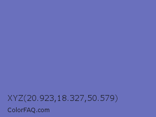 XYZ 20.923,18.327,50.579 Color is a normal blue color and the nearest color is Toolbox #746cc0. Hex code #6a70bd and RGB value is rgb(106,112,189). In RGB color space, this color is composed of 42% red, 44% green, 74% blue, In CMYK color space, this color is composed of 44% cyan, 41% magenta, 0% yellow , 26% black , In HSL color space, this color has a hue angle of 236° , 39% saturation and 58% lightness.