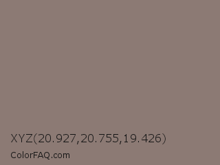 XYZ 20.927,20.755,19.426 Color is a normal color and the nearest color is Hemp #907874. Hex code #8c7a74 and RGB value is rgb(140,122,116). In RGB color space, this color is composed of 55% red, 48% green, 45% blue, In CMYK color space, this color is composed of 0% cyan, 13% magenta, 17% yellow , 45% black , In HSL color space, this color has a hue angle of 15° , 9% saturation and 50% lightness.