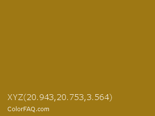 XYZ 20.943,20.753,3.564 Color is a normal orange color and the nearest color is Buttered Rum #a1750d. Hex code #9e7814 and RGB value is rgb(158,120,20). In RGB color space, this color is composed of 62% red, 47% green, 8% blue, In CMYK color space, this color is composed of 0% cyan, 24% magenta, 87% yellow , 38% black , In HSL color space, this color has a hue angle of 43° , 78% saturation and 35% lightness.
