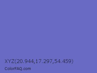 XYZ 20.944,17.297,54.459 Color is a normal blue color and the nearest color is Toolbox #746cc0. Hex code #696ac4 and RGB value is rgb(105,106,196). In RGB color space, this color is composed of 41% red, 42% green, 77% blue, In CMYK color space, this color is composed of 46% cyan, 46% magenta, 0% yellow , 23% black , In HSL color space, this color has a hue angle of 239° , 44% saturation and 59% lightness.