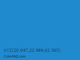 XYZ 20.947,22.989,62.365 Color is a normal blue color and the nearest color is Curious Blue #2596d1. Hex code #208acf and RGB value is rgb(32,138,207). In RGB color space, this color is composed of 13% red, 54% green, 81% blue, In CMYK color space, this color is composed of 85% cyan, 33% magenta, 0% yellow , 19% black , In HSL color space, this color has a hue angle of 204° , 73% saturation and 47% lightness.