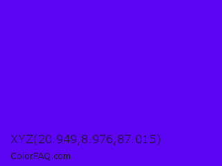 XYZ 20.949,8.976,87.015 Color is a normal violet color and the nearest color is Electric Indigo #6f00ff. Hex code #5c05f5 and RGB value is rgb(92,5,245). In RGB color space, this color is composed of 36% red, 2% green, 96% blue, In CMYK color space, this color is composed of 62% cyan, 98% magenta, 0% yellow , 4% black , In HSL color space, this color has a hue angle of 262° , 96% saturation and 49% lightness.