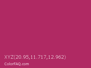 XYZ 20.95,11.717,12.962 Color is a normal rose color and the nearest color is Rich Maroon #b03060. Hex code #b02963 and RGB value is rgb(176,41,99). In RGB color space, this color is composed of 69% red, 16% green, 39% blue, In CMYK color space, this color is composed of 0% cyan, 77% magenta, 44% yellow , 31% black , In HSL color space, this color has a hue angle of 334° , 62% saturation and 43% lightness.