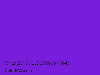 XYZ 20.971,9.986,67.84 Color is a normal violet color and the nearest color is Blue Violet #8a2be2. Hex code #781ddb and RGB value is rgb(120,29,219). In RGB color space, this color is composed of 47% red, 11% green, 86% blue, In CMYK color space, this color is composed of 45% cyan, 87% magenta, 0% yellow , 14% black , In HSL color space, this color has a hue angle of 269° , 77% saturation and 49% lightness.