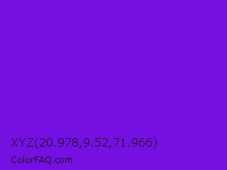 XYZ 20.978,9.52,71.966 Color is a normal violet color and the nearest color is French Violet #8806ce. Hex code #7410e1 and RGB value is rgb(116,16,225). In RGB color space, this color is composed of 45% red, 6% green, 88% blue, In CMYK color space, this color is composed of 48% cyan, 93% magenta, 0% yellow , 12% black , In HSL color space, this color has a hue angle of 269° , 87% saturation and 47% lightness.