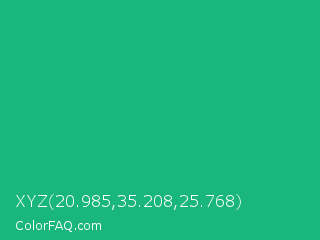 XYZ 20.985,35.208,25.768 Color is a normal green color and the nearest color is Mountain Meadow Crayola #1ab385. Hex code #1ab67f and RGB value is rgb(26,182,127). In RGB color space, this color is composed of 10% red, 71% green, 50% blue, In CMYK color space, this color is composed of 86% cyan, 0% magenta, 30% yellow , 29% black , In HSL color space, this color has a hue angle of 159° , 75% saturation and 41% lightness.