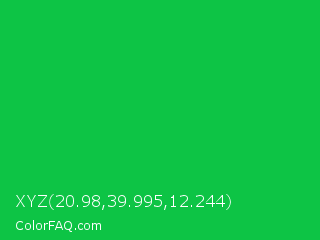 XYZ 20.98,39.995,12.244 Color is a normal green color and the nearest color is Dark Pastel Green #03c03c. Hex code #0dc445 and RGB value is rgb(13,196,69). In RGB color space, this color is composed of 5% red, 77% green, 27% blue, In CMYK color space, this color is composed of 93% cyan, 0% magenta, 65% yellow , 23% black , In HSL color space, this color has a hue angle of 138° , 88% saturation and 41% lightness.