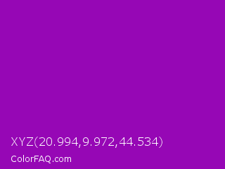 XYZ 20.994,9.972,44.534 Color is a normal purple color and the nearest color is Violet RYB #8601af. Hex code #9607b5 and RGB value is rgb(150,7,181). In RGB color space, this color is composed of 59% red, 3% green, 71% blue, In CMYK color space, this color is composed of 17% cyan, 96% magenta, 0% yellow , 29% black , In HSL color space, this color has a hue angle of 289° , 93% saturation and 37% lightness.