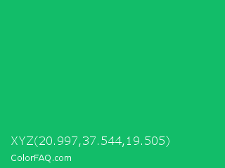 XYZ 20.997,37.544,19.505 Color is a normal green color and the nearest color is Green Crayola #1cac78. Hex code #12bd69 and RGB value is rgb(18,189,105). In RGB color space, this color is composed of 7% red, 74% green, 41% blue, In CMYK color space, this color is composed of 90% cyan, 0% magenta, 44% yellow , 26% black , In HSL color space, this color has a hue angle of 151° , 83% saturation and 41% lightness.