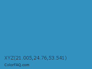 XYZ 21.005,24.76,53.541 Color is a normal blue color and the nearest color is Boston Blue #3b91b4. Hex code #3391c0 and RGB value is rgb(51,145,192). In RGB color space, this color is composed of 20% red, 57% green, 75% blue, In CMYK color space, this color is composed of 73% cyan, 24% magenta, 0% yellow , 25% black , In HSL color space, this color has a hue angle of 200° , 58% saturation and 48% lightness.