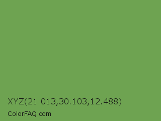 XYZ 21.013,30.103,12.488 Color is a normal green color and the nearest color is Asparagus Green #7ba05b. Hex code #6ea351 and RGB value is rgb(110,163,81). In RGB color space, this color is composed of 43% red, 64% green, 32% blue, In CMYK color space, this color is composed of 33% cyan, 0% magenta, 50% yellow , 36% black , In HSL color space, this color has a hue angle of 99° , 34% saturation and 48% lightness.