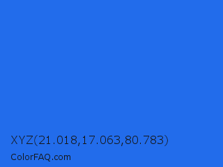 XYZ 21.018,17.063,80.783 Color is a normal blue color and the nearest color is Blue Crayola #1f75fe. Hex code #226ceb and RGB value is rgb(34,108,235). In RGB color space, this color is composed of 13% red, 42% green, 92% blue, In CMYK color space, this color is composed of 86% cyan, 54% magenta, 0% yellow , 8% black , In HSL color space, this color has a hue angle of 218° , 83% saturation and 53% lightness.