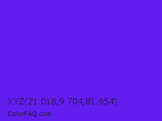 XYZ 21.018,9.704,81.654 Color is a normal indigo color and the nearest color is Han Purple #5218fa. Hex code #631dee and RGB value is rgb(99,29,238). In RGB color space, this color is composed of 39% red, 11% green, 93% blue, In CMYK color space, this color is composed of 58% cyan, 88% magenta, 0% yellow , 7% black , In HSL color space, this color has a hue angle of 260° , 86% saturation and 52% lightness.