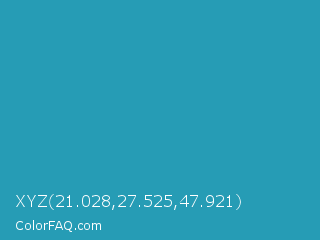 XYZ 21.028,27.525,47.921 Color is a normal cyan color and the nearest color is Eastern Blue #1e9ab0. Hex code #269cb5 and RGB value is rgb(38,156,181). In RGB color space, this color is composed of 15% red, 61% green, 71% blue, In CMYK color space, this color is composed of 79% cyan, 14% magenta, 0% yellow , 29% black , In HSL color space, this color has a hue angle of 190° , 65% saturation and 43% lightness.