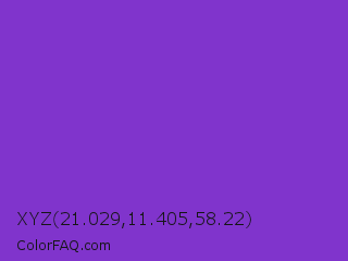 XYZ 21.029,11.405,58.22 Color is a normal violet color and the nearest color is Dark Orchid #9932cc. Hex code #8034cc and RGB value is rgb(128,52,204). In RGB color space, this color is composed of 50% red, 20% green, 80% blue, In CMYK color space, this color is composed of 37% cyan, 75% magenta, 0% yellow , 20% black , In HSL color space, this color has a hue angle of 270° , 60% saturation and 50% lightness.