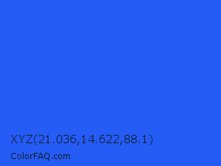 XYZ 21.036,14.622,88.1 Color is a normal blue color and the nearest color is Blue Crayola #1f75fe. Hex code #245cf5 and RGB value is rgb(36,92,245). In RGB color space, this color is composed of 14% red, 36% green, 96% blue, In CMYK color space, this color is composed of 85% cyan, 62% magenta, 0% yellow , 4% black , In HSL color space, this color has a hue angle of 224° , 91% saturation and 55% lightness.