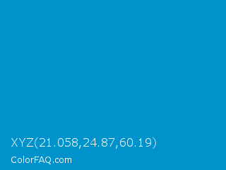 XYZ 21.058,24.87,60.19 Color is a normal blue color and the nearest color is Rich Electric Blue #0892d0. Hex code #0092cb and RGB value is rgb(0,146,203). In RGB color space, this color is composed of 0% red, 57% green, 80% blue, In CMYK color space, this color is composed of 100% cyan, 28% magenta, 0% yellow , 20% black , In HSL color space, this color has a hue angle of 197° , 100% saturation and 40% lightness.