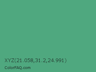 XYZ 21.058,31.2,24.991 Color is a normal green color and the nearest color is Ocean Green #41aa78. Hex code #4fa87f and RGB value is rgb(79,168,127). In RGB color space, this color is composed of 31% red, 66% green, 50% blue, In CMYK color space, this color is composed of 53% cyan, 0% magenta, 24% yellow , 34% black , In HSL color space, this color has a hue angle of 152° , 36% saturation and 48% lightness.