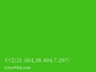 XYZ 21.064,38.494,7.297 Color is a normal green color and the nearest color is Kelly Green #4cbb17. Hex code #42bf1a and RGB value is rgb(66,191,26). In RGB color space, this color is composed of 26% red, 75% green, 10% blue, In CMYK color space, this color is composed of 65% cyan, 0% magenta, 86% yellow , 25% black , In HSL color space, this color has a hue angle of 105° , 76% saturation and 43% lightness.