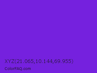 XYZ 21.065,10.144,69.955 Color is a normal violet color and the nearest color is Blue Violet #8a2be2. Hex code #7521de and RGB value is rgb(117,33,222). In RGB color space, this color is composed of 46% red, 13% green, 87% blue, In CMYK color space, this color is composed of 47% cyan, 85% magenta, 0% yellow , 13% black , In HSL color space, this color has a hue angle of 267° , 74% saturation and 50% lightness.