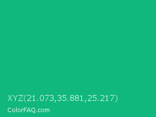 XYZ 21.073,35.881,25.217 Color is a normal green color and the nearest color is Mountain Meadow Crayola #1ab385. Hex code #11b87d and RGB value is rgb(17,184,125). In RGB color space, this color is composed of 7% red, 72% green, 49% blue, In CMYK color space, this color is composed of 91% cyan, 0% magenta, 32% yellow , 28% black , In HSL color space, this color has a hue angle of 159° , 83% saturation and 39% lightness.