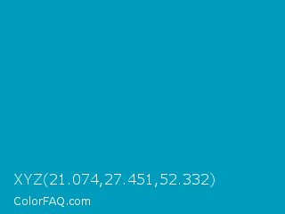 XYZ 21.074,27.451,52.332 Color is a normal cyan color and the nearest color is Pacific Blue Crayola #009dc4. Hex code #009cbd and RGB value is rgb(0,156,189). In RGB color space, this color is composed of 0% red, 61% green, 74% blue, In CMYK color space, this color is composed of 100% cyan, 17% magenta, 0% yellow , 26% black , In HSL color space, this color has a hue angle of 190° , 100% saturation and 37% lightness.