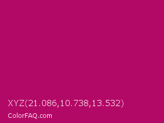 XYZ 21.086,10.738,13.532 Color is a normal magenta color and the nearest color is Lipstick #ab0563. Hex code #b30966 and RGB value is rgb(179,9,102). In RGB color space, this color is composed of 70% red, 4% green, 40% blue, In CMYK color space, this color is composed of 0% cyan, 95% magenta, 43% yellow , 30% black , In HSL color space, this color has a hue angle of 327° , 90% saturation and 37% lightness.