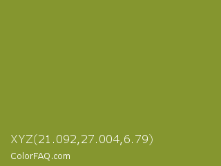 XYZ 21.092,27.004,6.79 Color is a normal yellow color and the nearest color is Sycamore #908d39. Hex code #85962f and RGB value is rgb(133,150,47). In RGB color space, this color is composed of 52% red, 59% green, 18% blue, In CMYK color space, this color is composed of 11% cyan, 0% magenta, 69% yellow , 41% black , In HSL color space, this color has a hue angle of 70° , 52% saturation and 39% lightness.