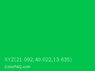 XYZ 21.092,40.022,13.635 Color is a normal green color and the nearest color is Dark Pastel Green #03c03c. Hex code #01c44d and RGB value is rgb(1,196,77). In RGB color space, this color is composed of 0% red, 77% green, 30% blue, In CMYK color space, this color is composed of 99% cyan, 0% magenta, 61% yellow , 23% black , In HSL color space, this color has a hue angle of 143° , 99% saturation and 39% lightness.