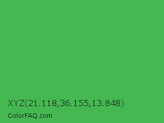 XYZ 21.118,36.155,13.848 Color is a normal green color and the nearest color is Chateau Green #40a860. Hex code #45b852 and RGB value is rgb(69,184,82). In RGB color space, this color is composed of 27% red, 72% green, 32% blue, In CMYK color space, this color is composed of 63% cyan, 0% magenta, 55% yellow , 28% black , In HSL color space, this color has a hue angle of 127° , 45% saturation and 50% lightness.