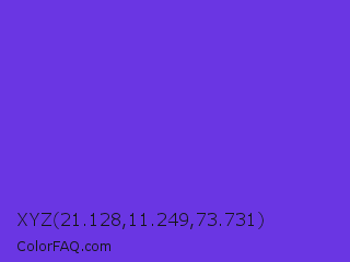 XYZ 21.128,11.249,73.731 Color is a normal indigo color and the nearest color is Majorelle Blue #6050dc. Hex code #6a36e3 and RGB value is rgb(106,54,227). In RGB color space, this color is composed of 42% red, 21% green, 89% blue, In CMYK color space, this color is composed of 53% cyan, 76% magenta, 0% yellow , 11% black , In HSL color space, this color has a hue angle of 258° , 76% saturation and 55% lightness.