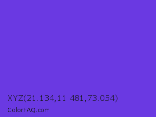 XYZ 21.134,11.481,73.054 Color is a normal indigo color and the nearest color is Majorelle Blue #6050dc. Hex code #6a39e2 and RGB value is rgb(106,57,226). In RGB color space, this color is composed of 42% red, 22% green, 89% blue, In CMYK color space, this color is composed of 53% cyan, 75% magenta, 0% yellow , 11% black , In HSL color space, this color has a hue angle of 257° , 74% saturation and 55% lightness.