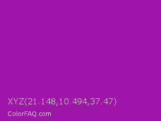 XYZ 21.148,10.494,37.47 Color is a normal magenta color and the nearest color is Violet Eggplant #991199. Hex code #9d15a7 and RGB value is rgb(157,21,167). In RGB color space, this color is composed of 62% red, 8% green, 65% blue, In CMYK color space, this color is composed of 6% cyan, 87% magenta, 0% yellow , 35% black , In HSL color space, this color has a hue angle of 296° , 78% saturation and 37% lightness.