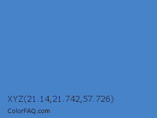 XYZ 21.14,21.742,57.726 Color is a normal blue color and the nearest color is Cyan Blue Azure #4682bf. Hex code #4783c8 and RGB value is rgb(71,131,200). In RGB color space, this color is composed of 28% red, 51% green, 78% blue, In CMYK color space, this color is composed of 65% cyan, 35% magenta, 0% yellow , 22% black , In HSL color space, this color has a hue angle of 212° , 54% saturation and 53% lightness.