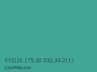 XYZ 21.175,30.532,33.211 Color is a normal cyan color and the nearest color is Zomp #39a78e. Hex code #40a695 and RGB value is rgb(64,166,149). In RGB color space, this color is composed of 25% red, 65% green, 58% blue, In CMYK color space, this color is composed of 61% cyan, 0% magenta, 10% yellow , 35% black , In HSL color space, this color has a hue angle of 170° , 44% saturation and 45% lightness.