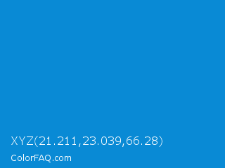 XYZ 21.211,23.039,66.28 Color is a normal blue color and the nearest color is Rich Electric Blue #0892d0. Hex code #098ad5 and RGB value is rgb(9,138,213). In RGB color space, this color is composed of 4% red, 54% green, 84% blue, In CMYK color space, this color is composed of 96% cyan, 35% magenta, 0% yellow , 16% black , In HSL color space, this color has a hue angle of 202° , 92% saturation and 44% lightness.